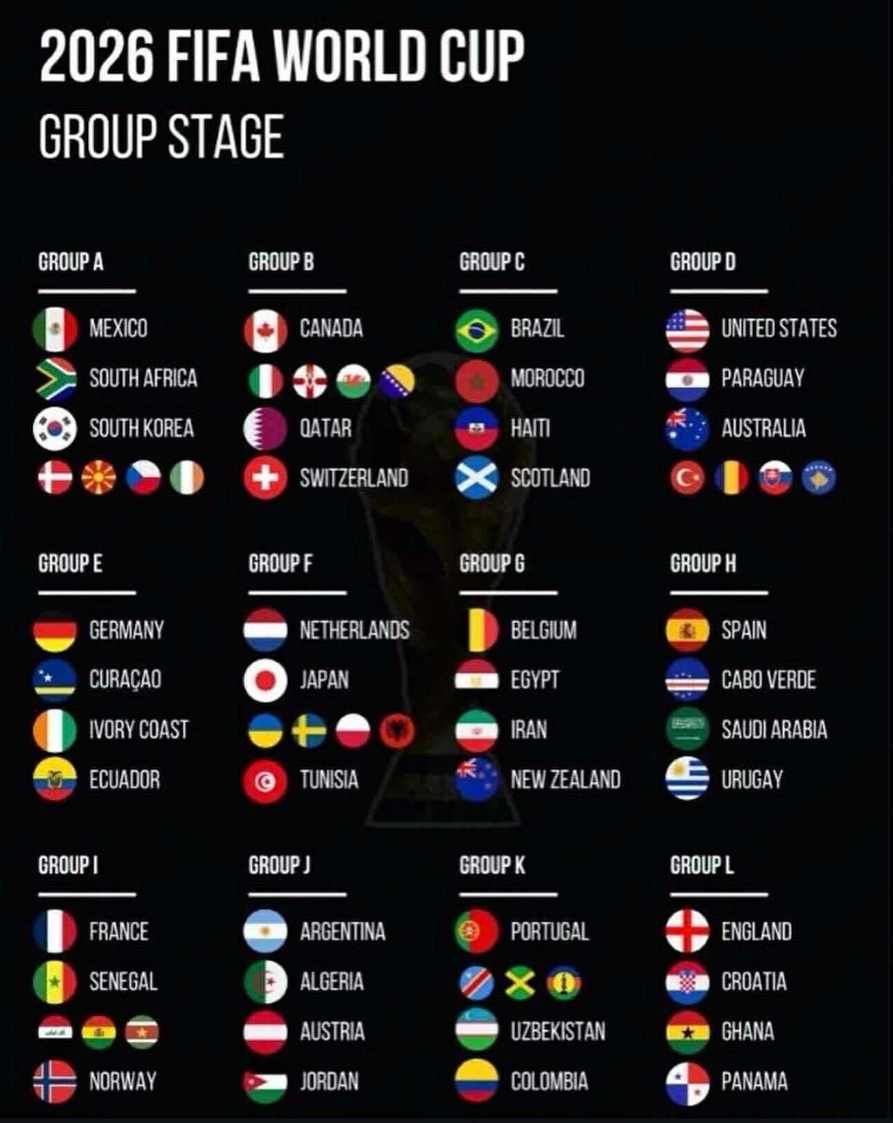 Na MS 2026 bude 12 skupín, označených od A po L. V každej skupine budú 4 tímy.